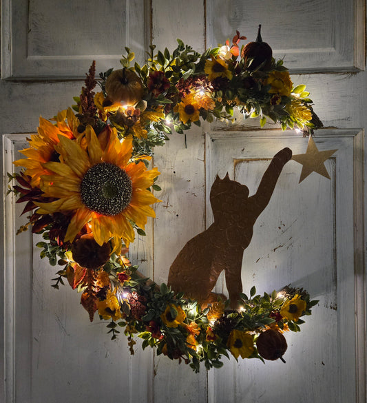 Fall Cat Crescent Moon Sunflower Wreath