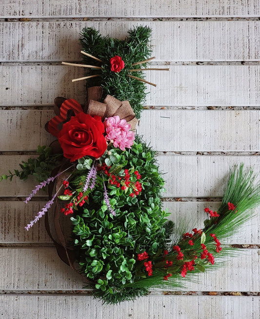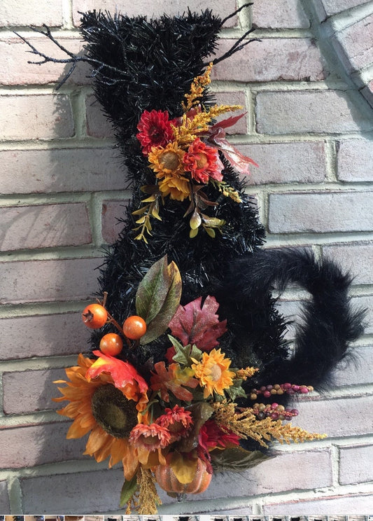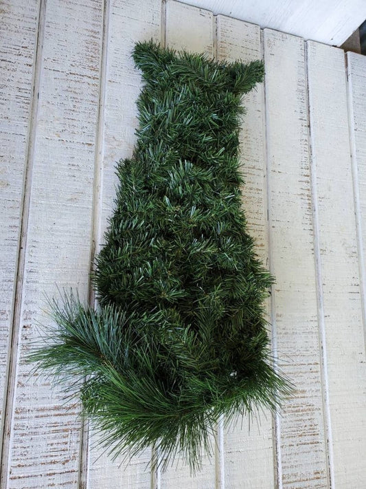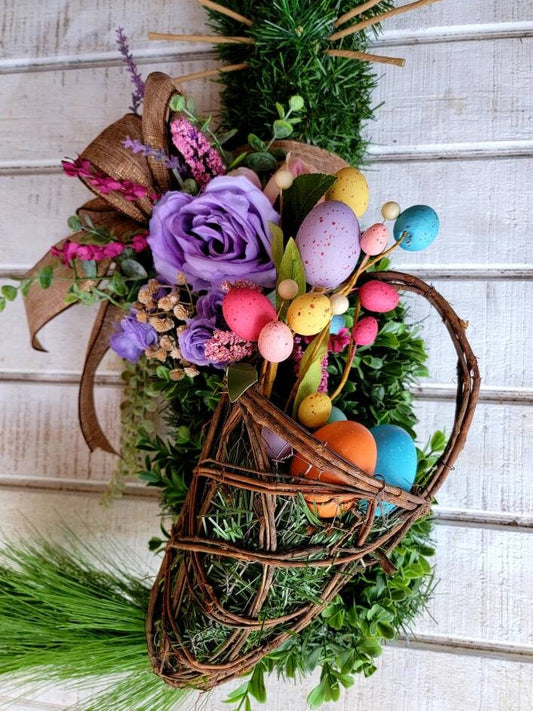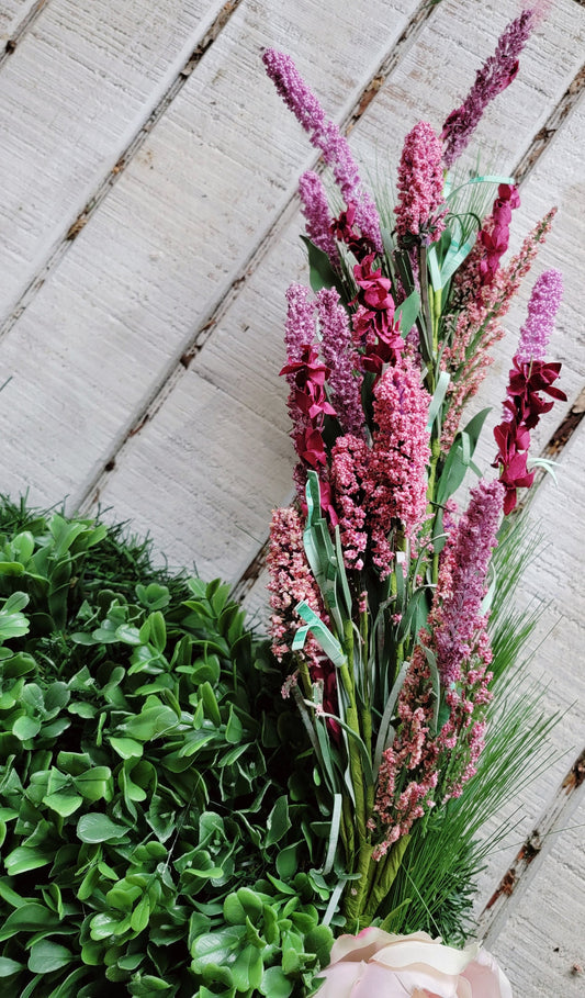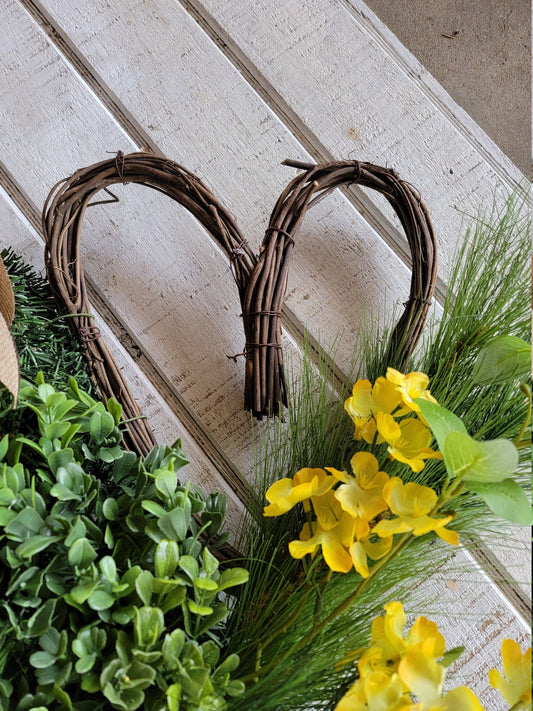 Spring Yellow & Purple Flowers Boxwood Cat Wreath w/ Grapevine Heart Tail