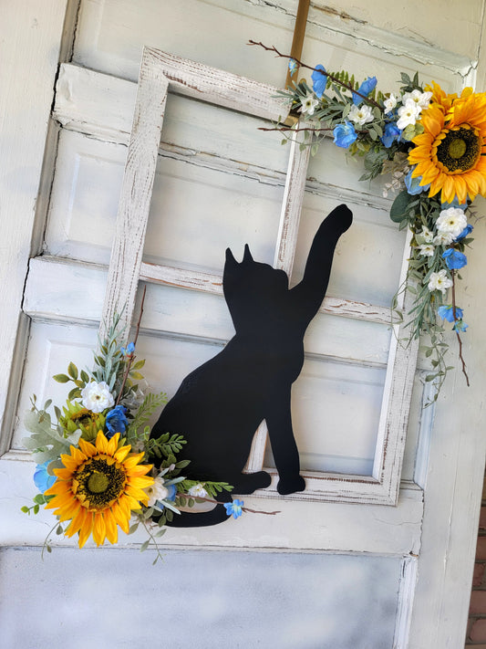 Blue & White Rustic Sunflower Window Pane Cat Wall Art